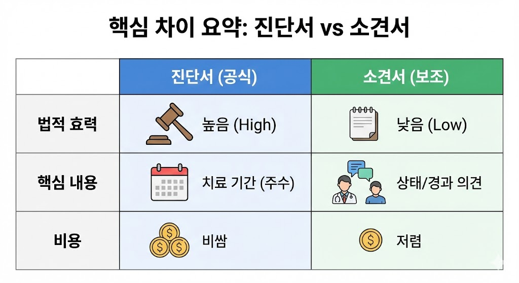 ✔ 소견서는 진단서를 “대체”할 수 없음