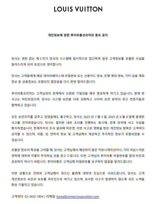 루이비통 측은 2025년 6월 8일 외부 해킹 시도를 확인했고, 7월 2일에 이를 고객에게 공식적으로 안내했다고 밝혔습니다.