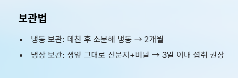 - 냉장 보관: 생잎 그대로 신문지+비닐 → 3일 이내 섭취 권장