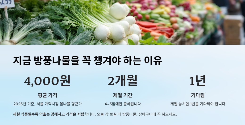 - 2025년 기준, 서울 가락시장 봄나물 평균가는 4,000원/단, 단 4~5월에만 출하됩니다.