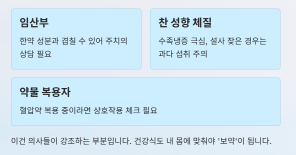- 체질적으로 찬 성향(수족냉증 극심, 설사 잦은 경우)은 과다 섭취 주의