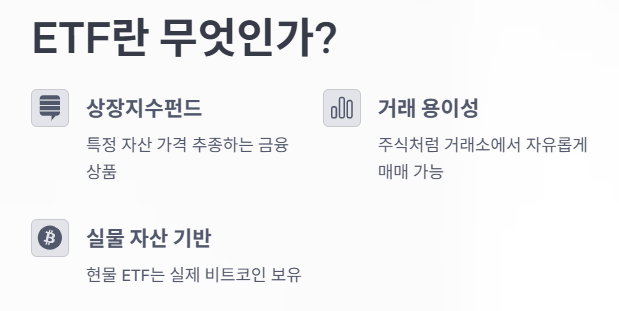 ETF는 Exchange Traded Fund의 약자로, 특정 자산의 가격을 추종하는 상장지수펀드입니다. 전통적인 주식처럼 거래소에서 자유롭게 사고팔 수 있는 장점이 있으며, 현물 ETF는 실제 자산(이 경우 비트코인)을 기반으로 운용됩니다.