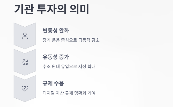 기관 자금은 단기 투기보다 장기 운용 중심이기 때문에, 시장의 급격한 가격 급등락을 완화하는 역할을 하게 됩니다.