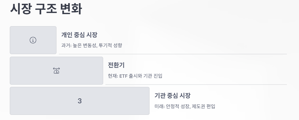 그동안 비트코인은 '비제도권의 대표 자산'이라는 이미지가 강했습니다. 하지만 ETF 상품을 통해 제도권 금융시장에서 투자 가능해지면서 다음과 같은 변화가 일어나고 있습니다.