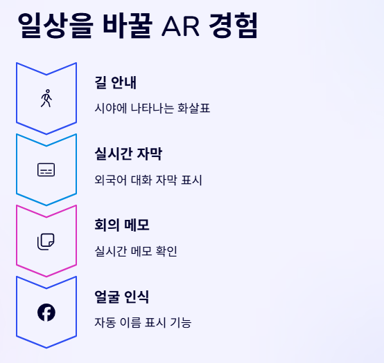 또는 회의 중 안경으로 실시간 메모를 확인하거나, 친구의 얼굴을 인식해 자동으로 이름이 떠오르는 기능까지.