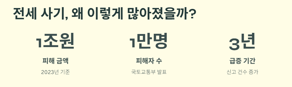 🔍 국토교통부에 따르면 2023년 기준 전세 사기 피해 금액은 약 1조 원에 달하며,