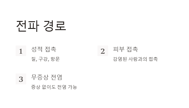 - 직접 접촉: 감염 부위와의 접촉으로 바이러스 전파.