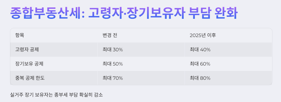 2025년 종부세 개편안에서 눈에 띄는 변화는 고령자 및 장기보유자 공제율 확대입니다.