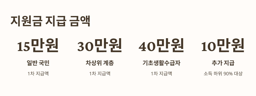 - 일반 국민 (소득 하위 90%): 총 25만원 (15만원 + 10만원)